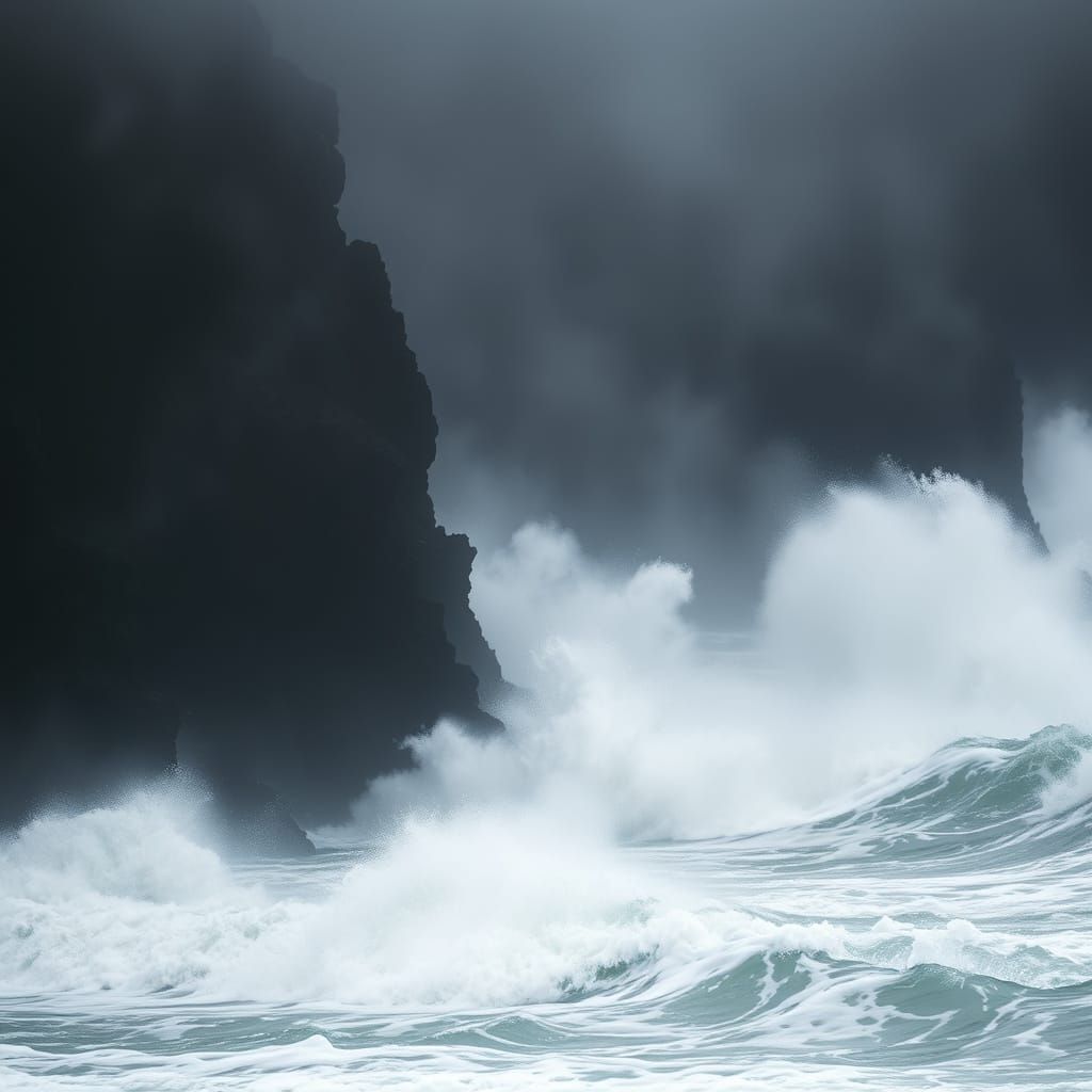 A dramatic photograph captures a turbulent sea shrouded in a milky mist, with waves crashing against dark cliffs. Shot in sharp focus with a DSLR, it evokes a powerful, naturalistic landscape.