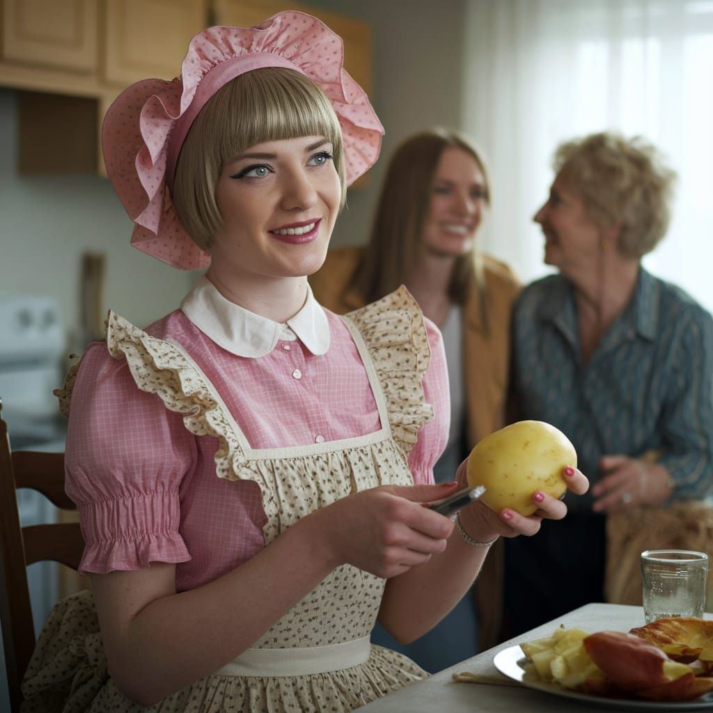 This cinematic image captures a young, feminine man with short blond hair and light makeup, dressed in a frilly vintage apron and headscarf. He is seated in a kitchen, peeling potatoes.