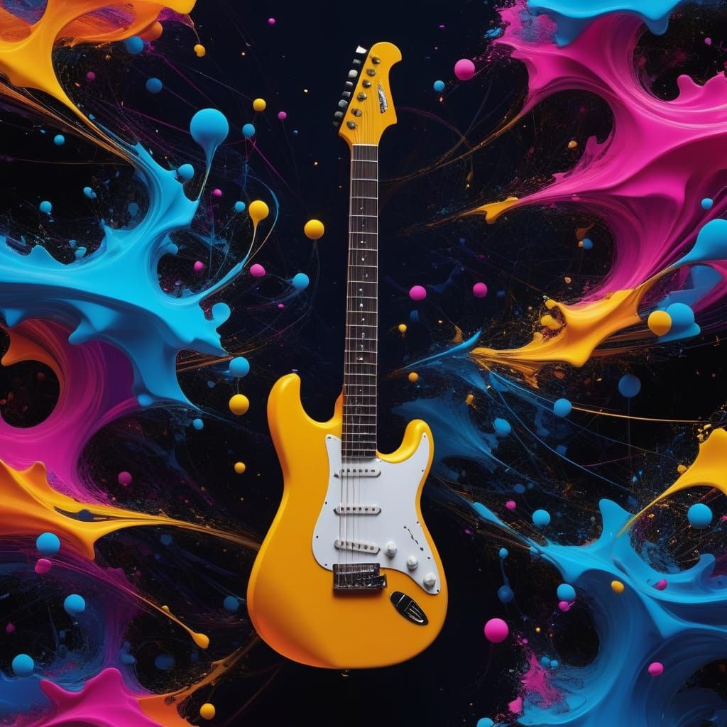 This dynamic abstract oil painting features bold brushstrokes in a vibrant magenta palette, complemented by blue, orange, and yellow accents. Swirling pixel structures and musical notes merge with the Telekom 'T' logo, creating a mesmerizing Technicolor dream.