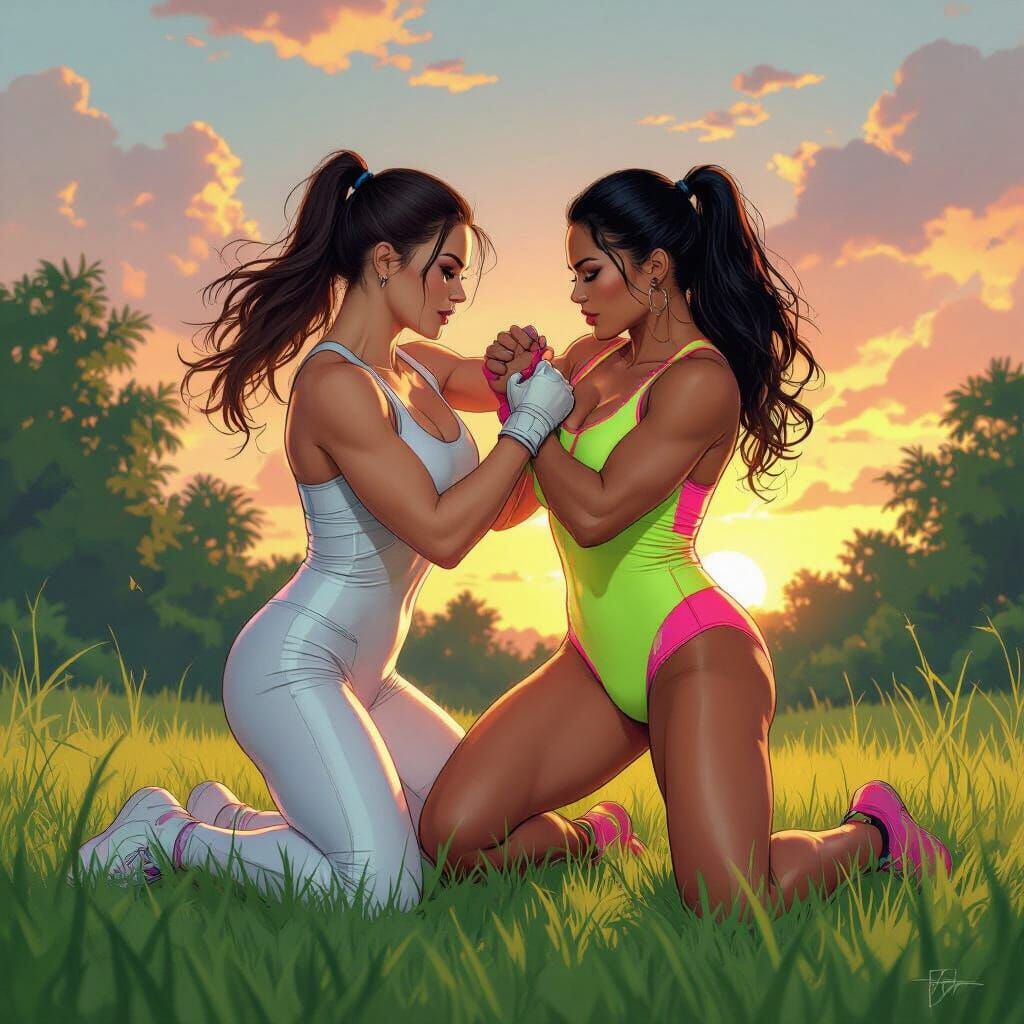 This image shows two women wrestling in a vibrant sunset setting. The scene is illuminated with professional lighting and dramatic shading, enhanced by a futuristic glow and cinematic atmosphere.