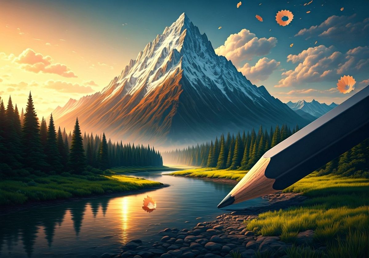 This image shows a surreal western mountain vista at golden hour. A giant pencil draws the landscape into existence, with sketch marks blending into reality. Rendered in a surrealist oil painting style with vivid colors and dramatic lighting.
