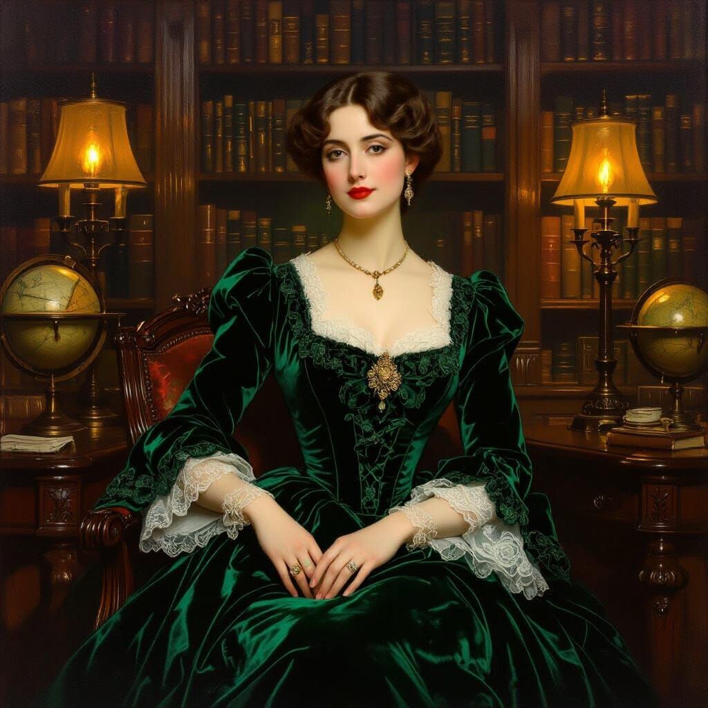 This image is a vintage oil painting portrait of a Victorian woman in a luxurious emerald gown. She stands in a detailed dark academia room, showcasing dramatic lighting and rich textures in a style reminiscent of classical masters.