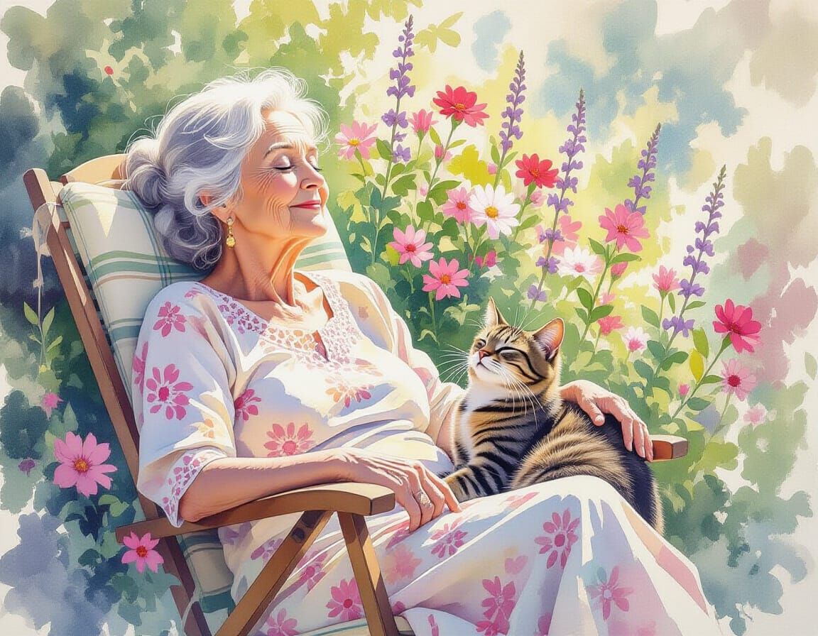 This image depicts an elderly woman finding serene inner peace with her tabby cat amidst a vibrant, messy watercolor flowerscape, creating a soft, dreamy atmosphere.