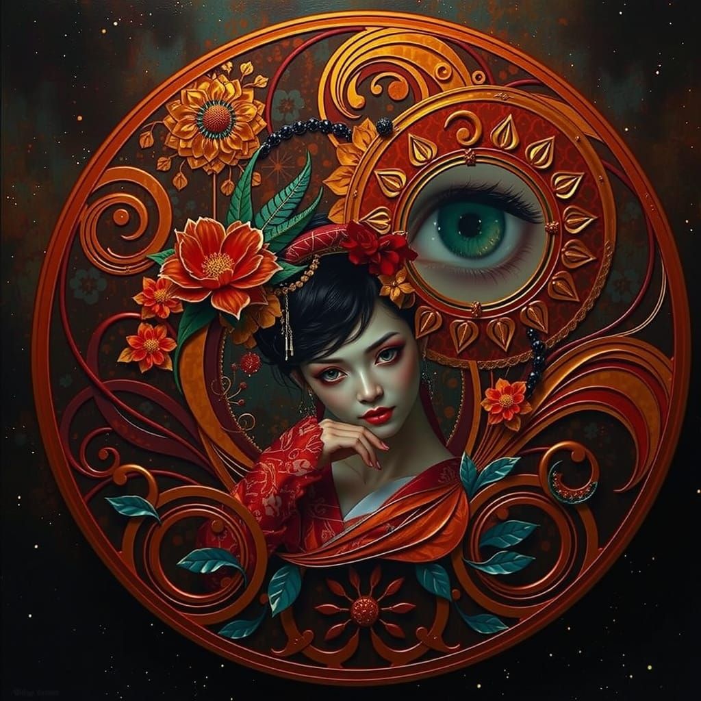 This image shows a close-up portrait of a geisha with striking black hair and green eyes. She wears a vibrant dress with golden motifs, reflected in a mirrored image against a cosmic background.