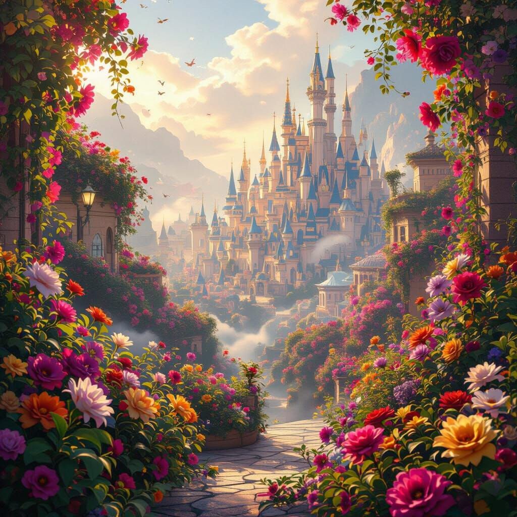 This digital matte painting depicts a stunning city overflowing with colorful flowers, radiating happiness. Soft, diffused lighting and volumetric fog create a magical, iridescent atmosphere with amethyst, sapphire, and emerald tones.