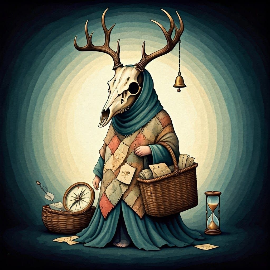 This haunting image depicts a child-like entity with a deer skull head, surrounded by a patchwork shroud of farewell letters, as it hums a lullaby in a forgotten language, pointing towards a safer haven. The artwork blends Gothic watercolor with whimsical children's book illustration flair, reminiscent o...