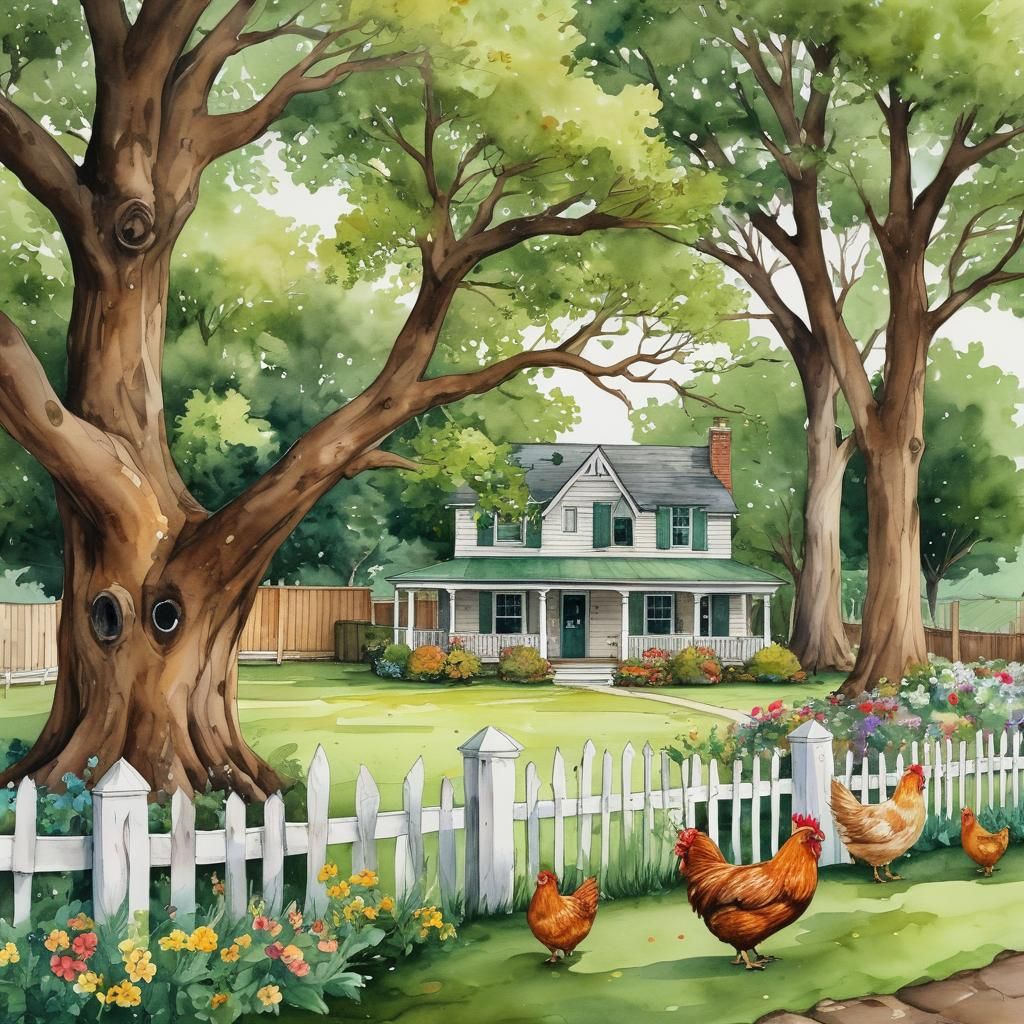 A vibrant alcohol ink watercolor painting of a quaint one-story farmhouse with chickens in the yard. A cat lounges on the porch, with a brown fence, big oak tree, and flower beds.