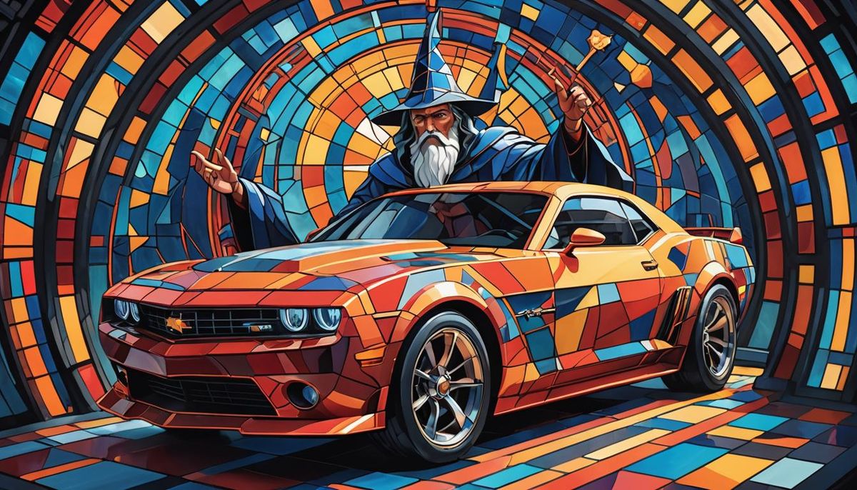 A stained glass window depicts a wizard driving a futuristic muscle car. The stained glass evokes cubist and art deco styles, with layered geometry and a maximalist aesthetic.