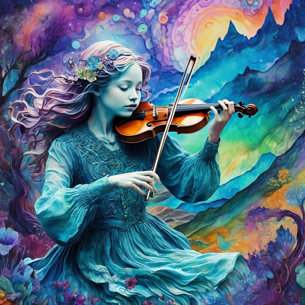 A vibrant collage art piece shows a musician playing a magical fiddle in a dreamlike landscape. Holographic accents and iridescent colors create a surreal, textured scene in an abstract expressionism style.
