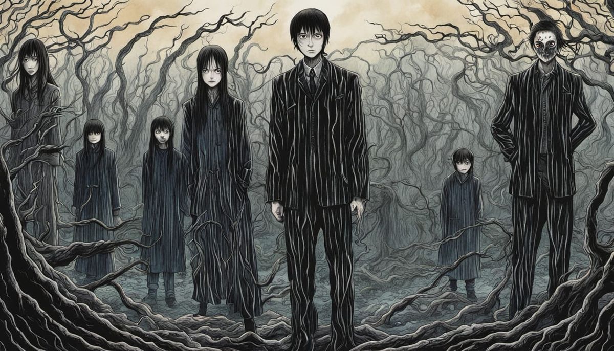 This haunting image depicts a mysterious figure ensnared by dark shadows, evoking an unrelenting sense of horror in a surreal, dreamlike atmosphere