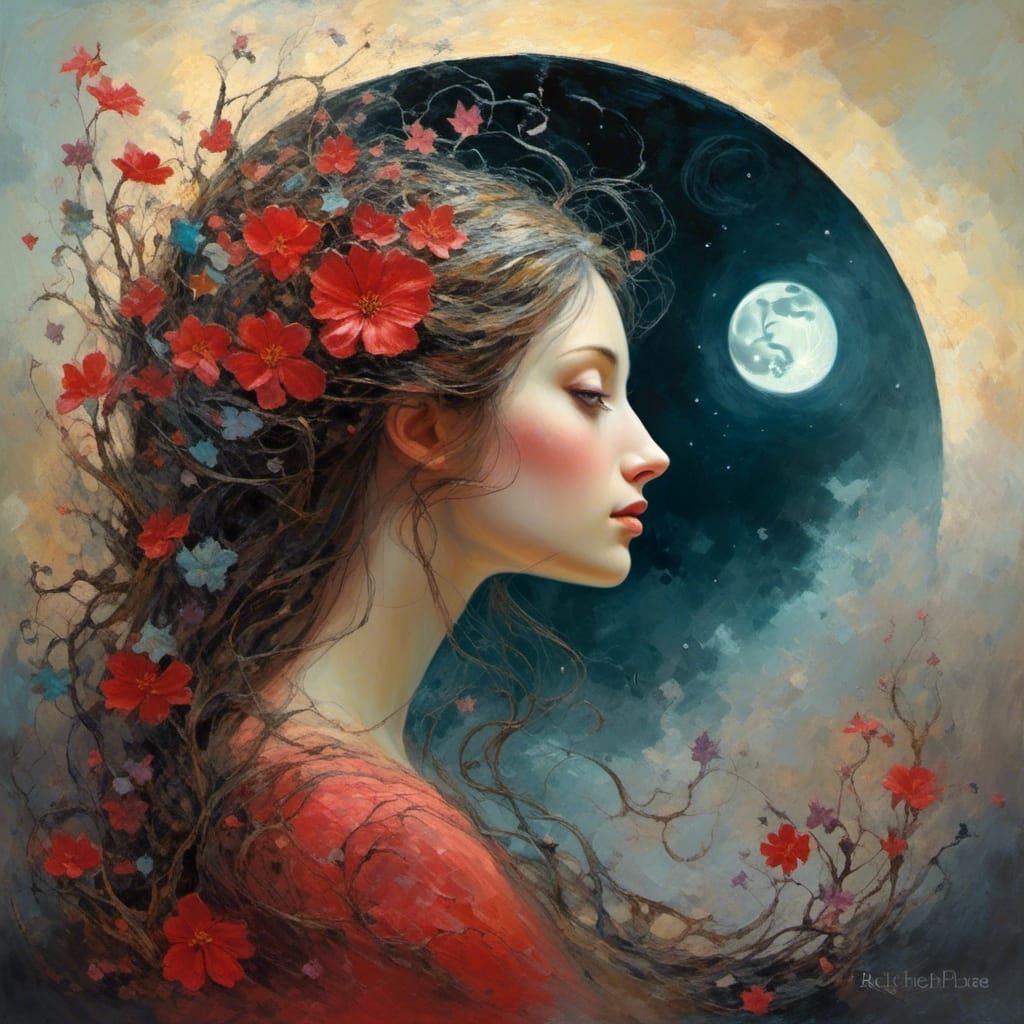 A striking picture of a woman in profile, set against a surreal alien landscape with giant moons. The scene evokes a cinematic blend of sci-fi and ethereal beauty, with a melancholic mist.