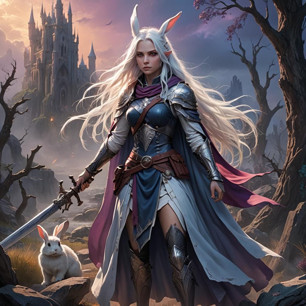 A striking picture of a rabbit-human hybrid warrior in a fantasy realm. She wields a sword and axe, her white hair and cape flowing in a cool, detailed environment. Digital art with vibrant colors.