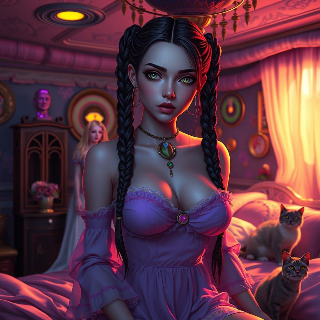 A dark fantasy concept art masterpiece showing Wednesday Adams in a whimsical, futuristic bedroom with a blond woman and a cat. Features hyperdetailed 8k resolution and dynamic lighting.