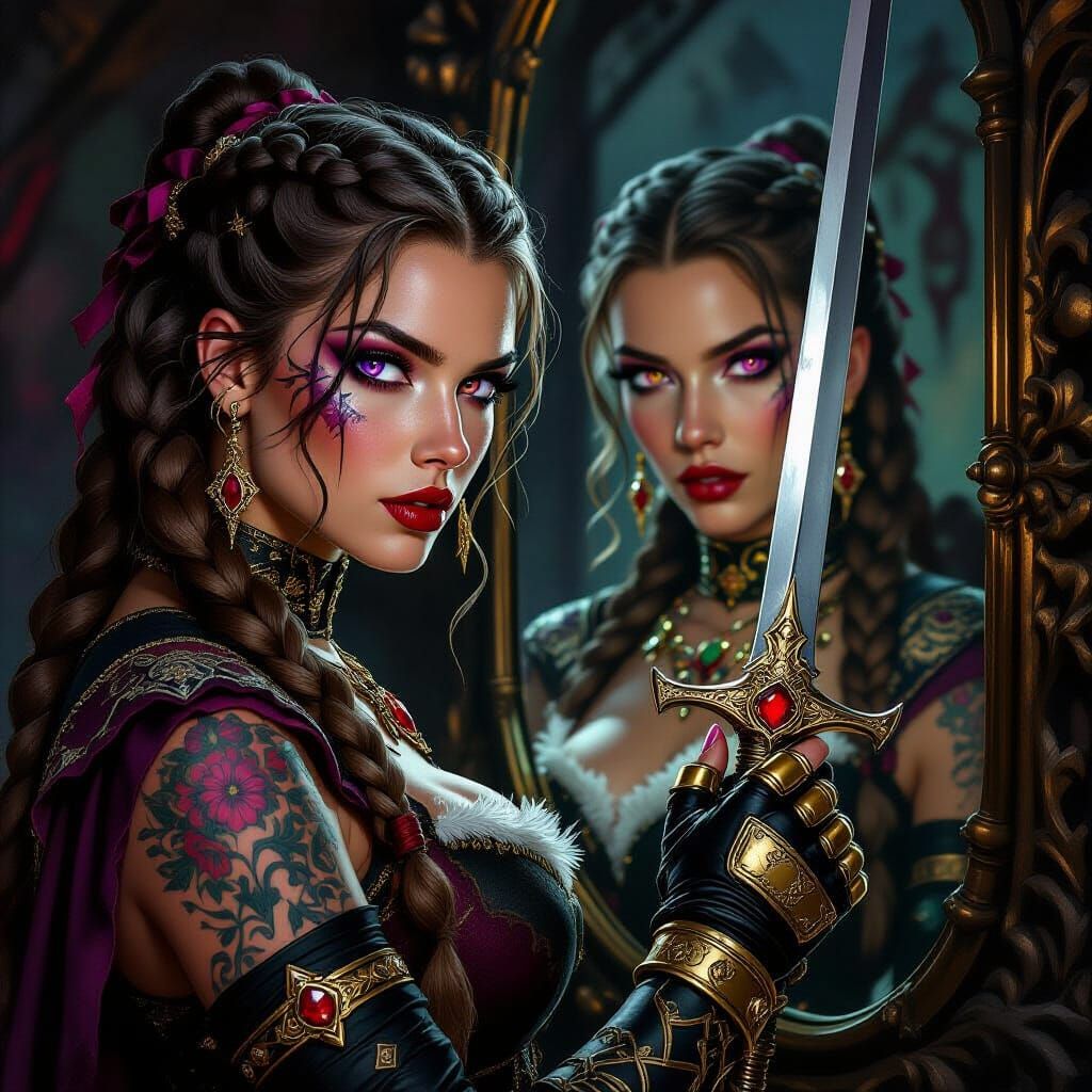 Female-Dragon-Princess, reflecting myself looking in a mirror, necklace, warrior-native-Viking, sword, one-eye purple, the other eye-orange...