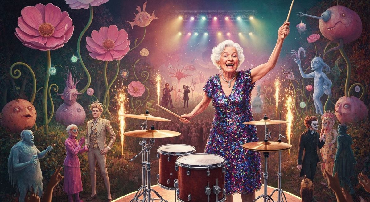 This image shows an elderly woman playing drums on stage in a sequined dress. The hyperrealistic image captures her youthful energy as she is surrounded by cheering fans, with colorful lights and pyrotechnics.