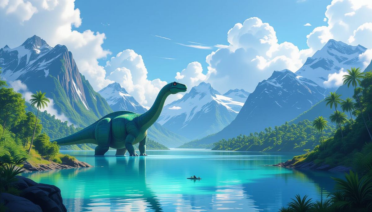 A vibrant image of a futuristic cyberpunk city on the water, featuring a sauropod dinosaur emerging from the clear water amid lush Jurassic jungle. The scene is rendered with bright colors.