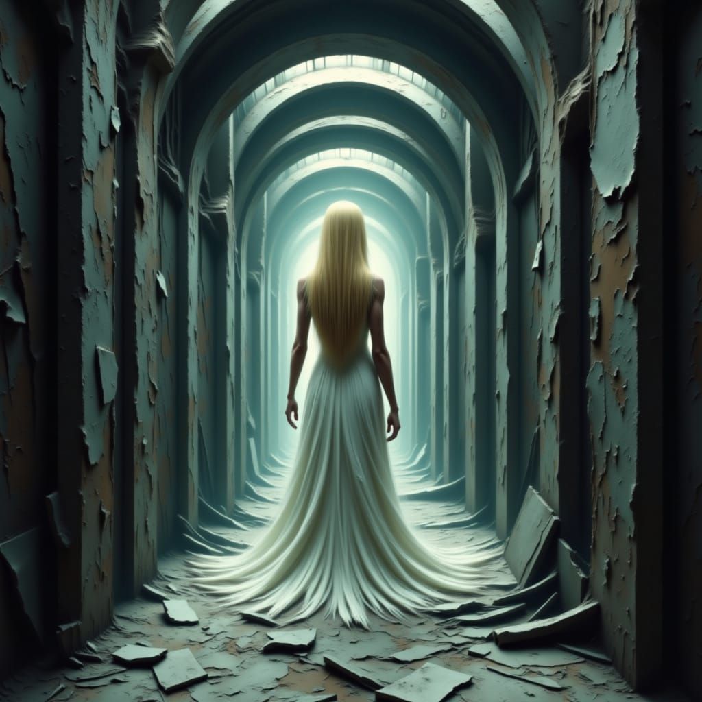 This image shows Maria in a white dress, her long blonde hair illuminated by volumetric lighting in Metropolis's industrial underground. The aesthetic blends futuristic design with cinematic and textural detail.