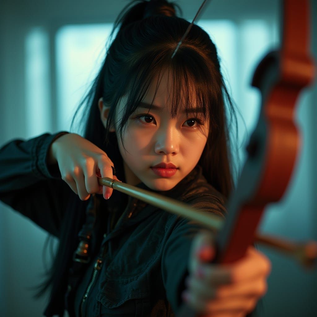 This image shows a 16-year-old Chinese American girl with black hair, dressed as a Kpop Demon Hunter. She holds a bow and arrow against a dramatic backdrop with cinematic lighting, in a muted color palette with bold accents.