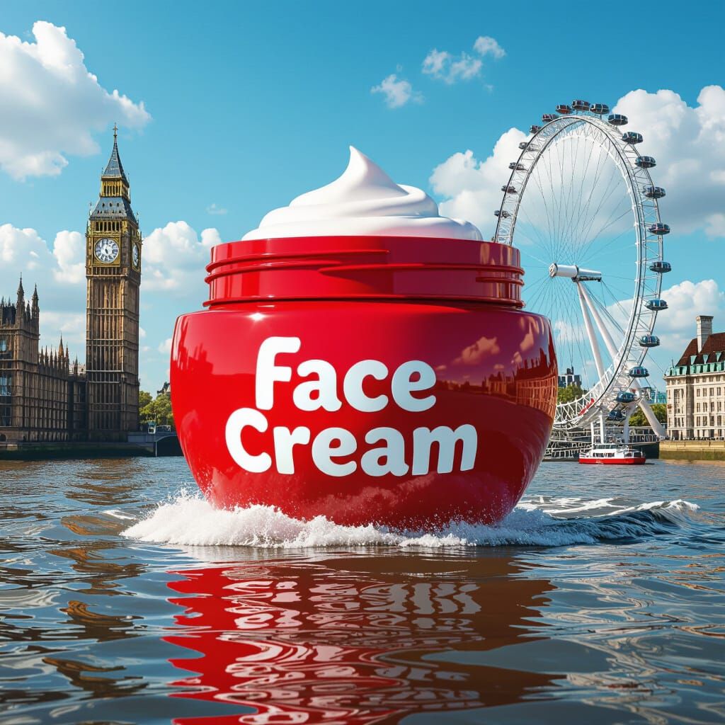 A massive, round, red face cream jar sails down the River Thames, passing famous London sights like Big Ben. The scene captures a sunny day with shimmering water and subtle waves, rendered in a vibrant, psychedelic-futuristic style.