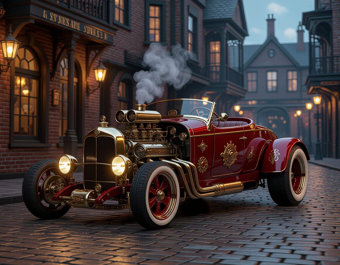 This image shows a steampunk hot rod with intricate details, set on a cobblestone street with Victorian architecture. Warm candlelight illuminates the scene with rich, elegant accents in a steampunk aesthetic.