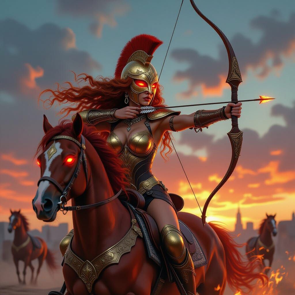 Generate stunning, photorealistic warrior women with fiery hair and bows. Create unique images for free with our AI.