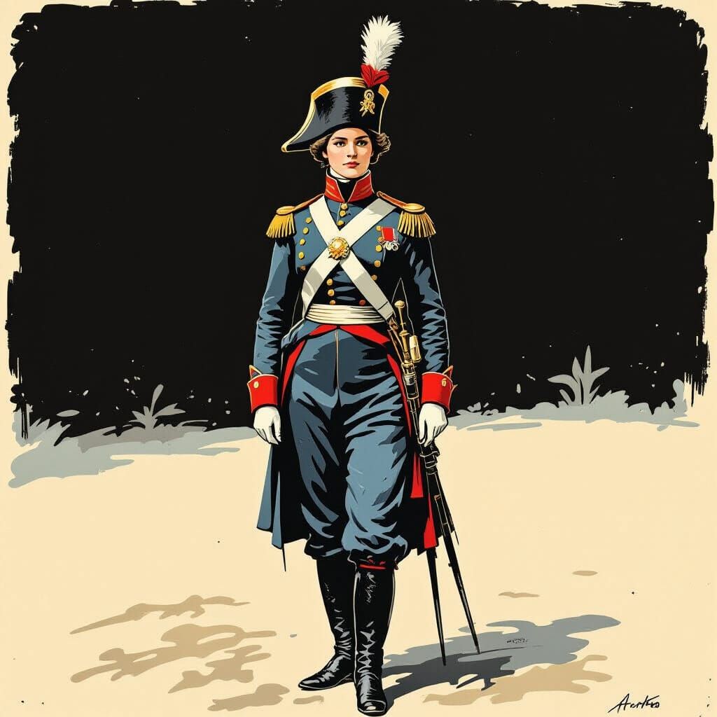 This striking image features a portrait of a French female soldier from the Napoleonic era, set against a stark black background.