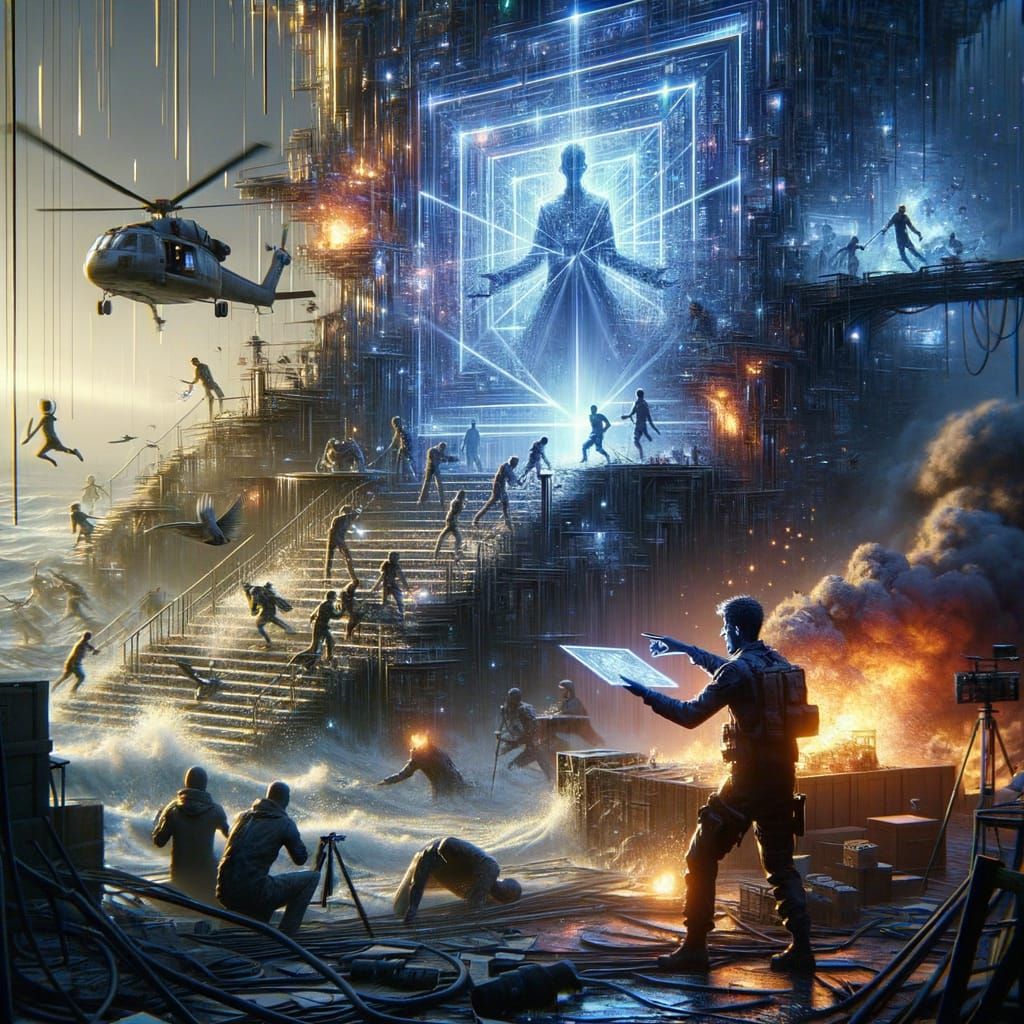 This image depicts a strategic analyst, Vael, projecting blocks of light that simulate possible futures, while adjusting environmental details to prevent disasters. Tense rescues and confrontations are highlighted, with visual effects showcasing his simulations, set against a backdrop of deep, complement...