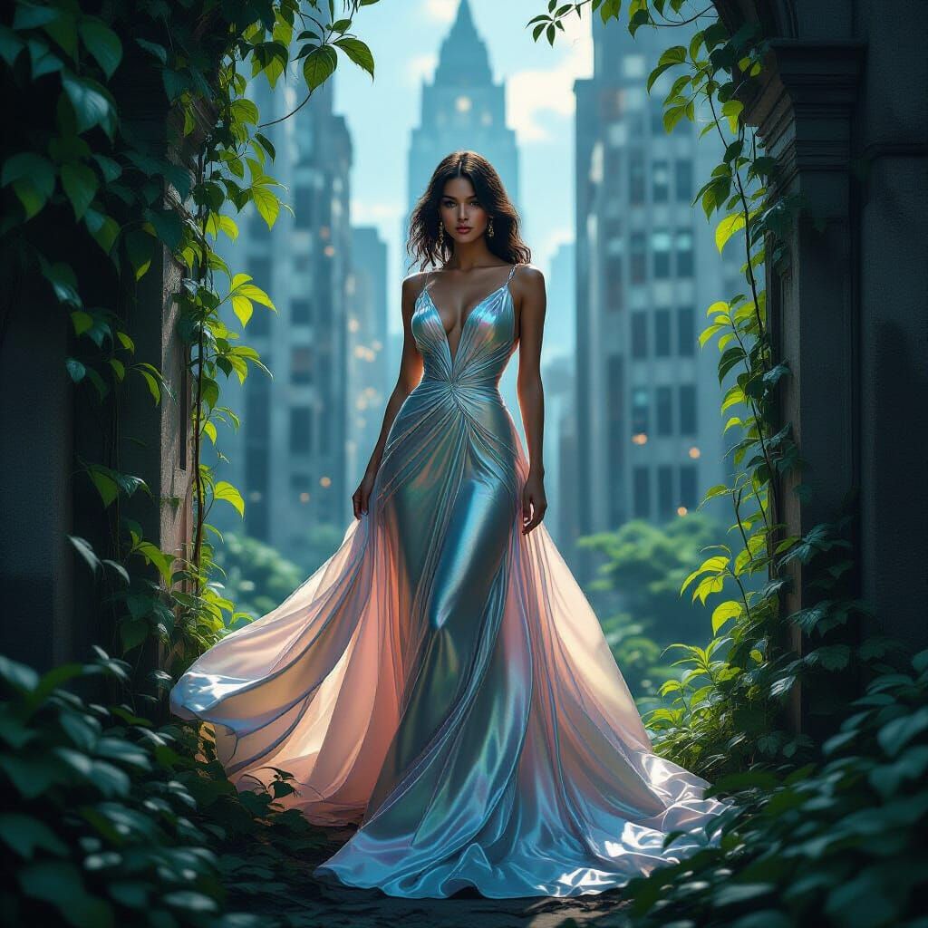 A hyperrealistic digital painting of a model in a silk gown amidst decaying art deco architecture. She features glowing tattoos and is surrounded by luminous vines, captured in dramatic, cinematic lighting.