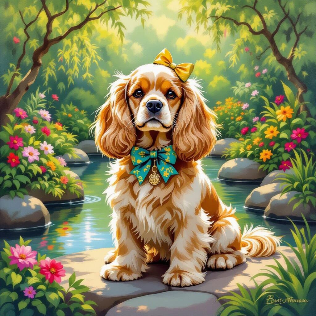 This image shows a golden English cocker spaniel with a bow in its hair, resting peacefully in a lush zen garden. The artwork features soft, warm brushstrokes.