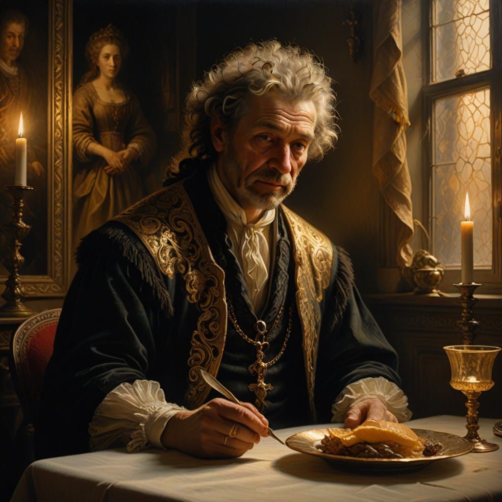 This image shows a man dining at a table, bathed in warm, dim light, with a mystical, ethereal woman formed from golden ectoplasm beside him in a baroque painting style.
