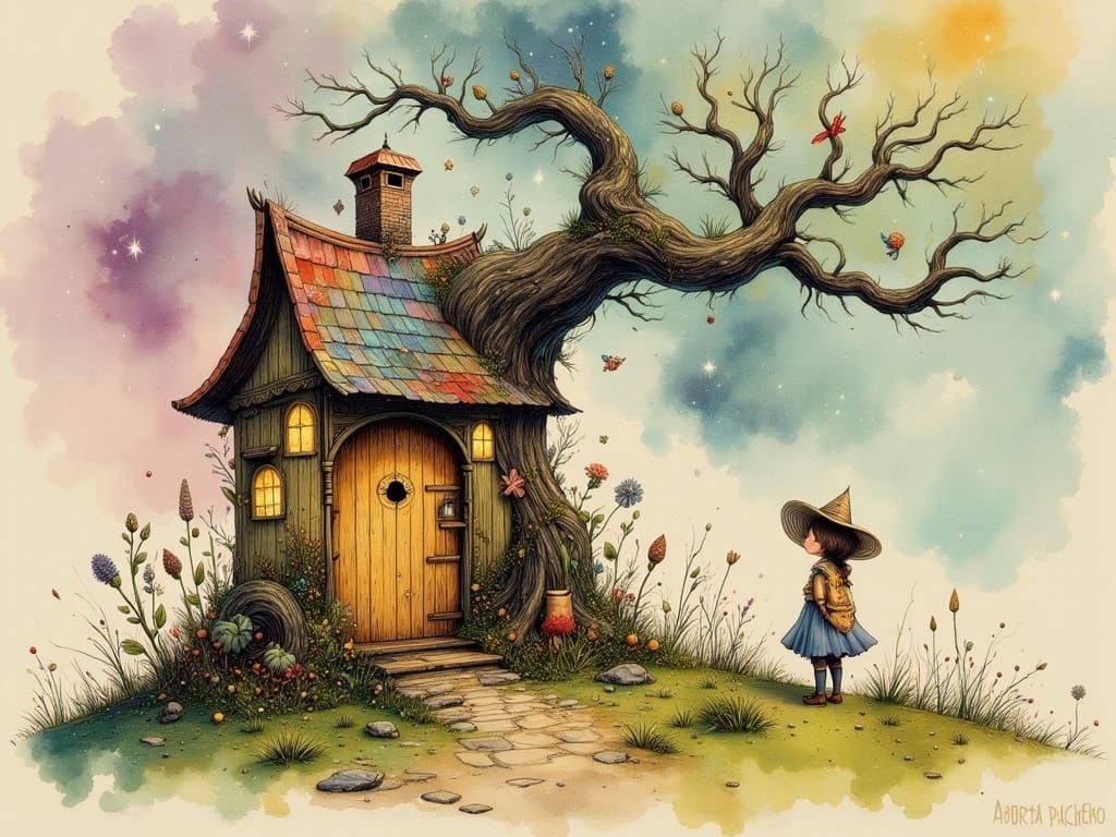 A whimsical illustration features a child near a surreal house and tree. The image evokes dreamlike qualities and is reminiscent of symbolic book illustrations.