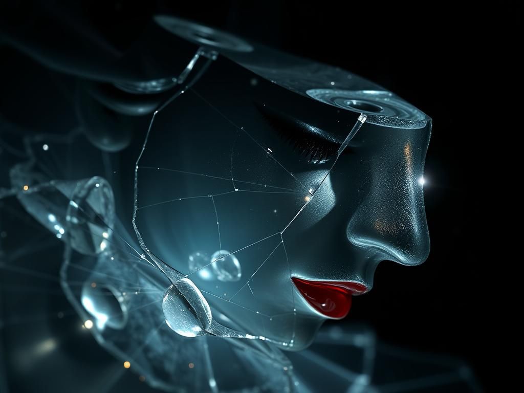 the heartache of joyous sorrow dance close up by artist "God and Goddess of sparkletwinkly shadow" Where did you land? Is a timebomb ticking in your perfect eye? falling as crystal clear cracked transparent deep dark shadows insouciant sculpture by dark background by artist "Oskar Schlemmer" portal ...