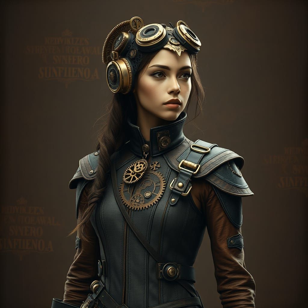 This image showcases a stunning, intricately detailed steampunk-inspired heroine set against a richly textured, deep-colored background with subtle gradient effects, blending traditional and digital media techniques for a vintage, industrial aesthetic.