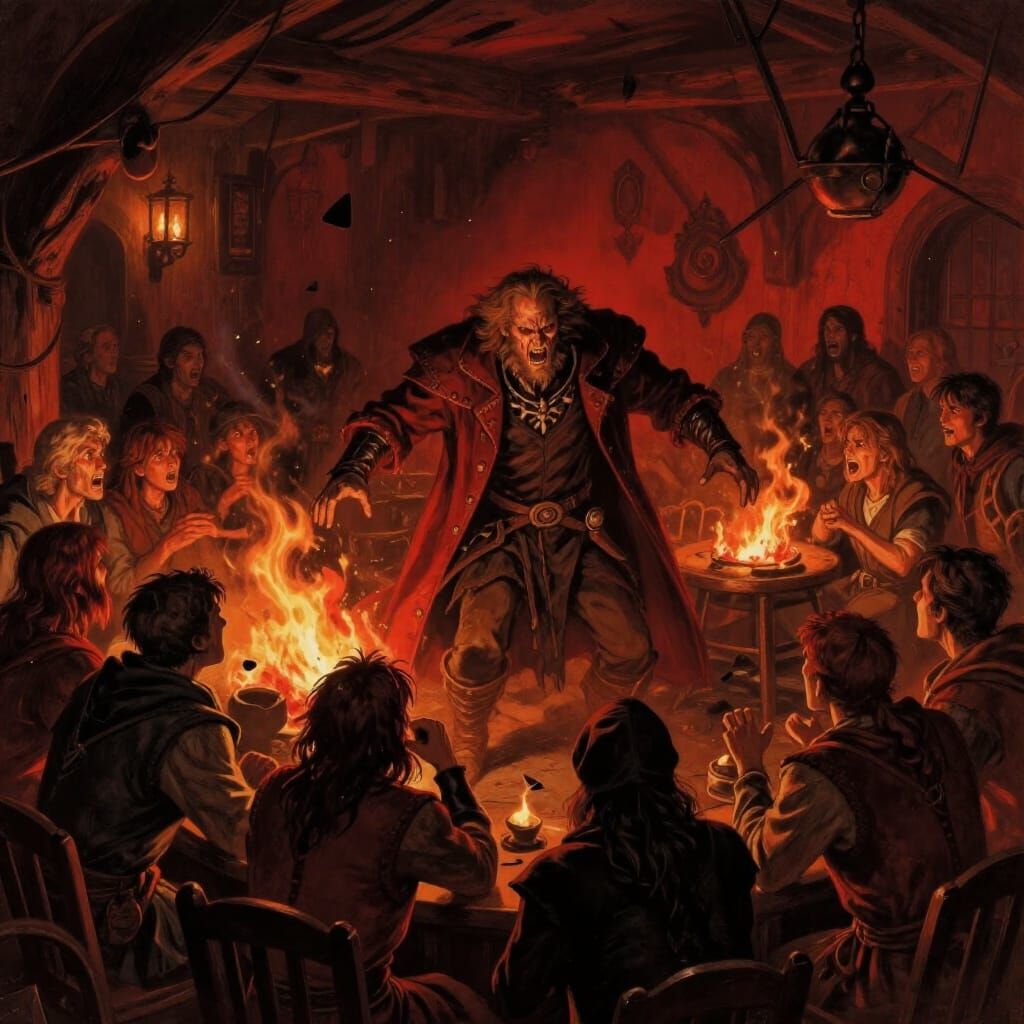 This image depicts a tavern scene erupting into chaos as a villain arrives, contrasting a tense atmosphere with pandemonium. Painted in a dark fantasy illustration style with dramatic lighting and deep colors.