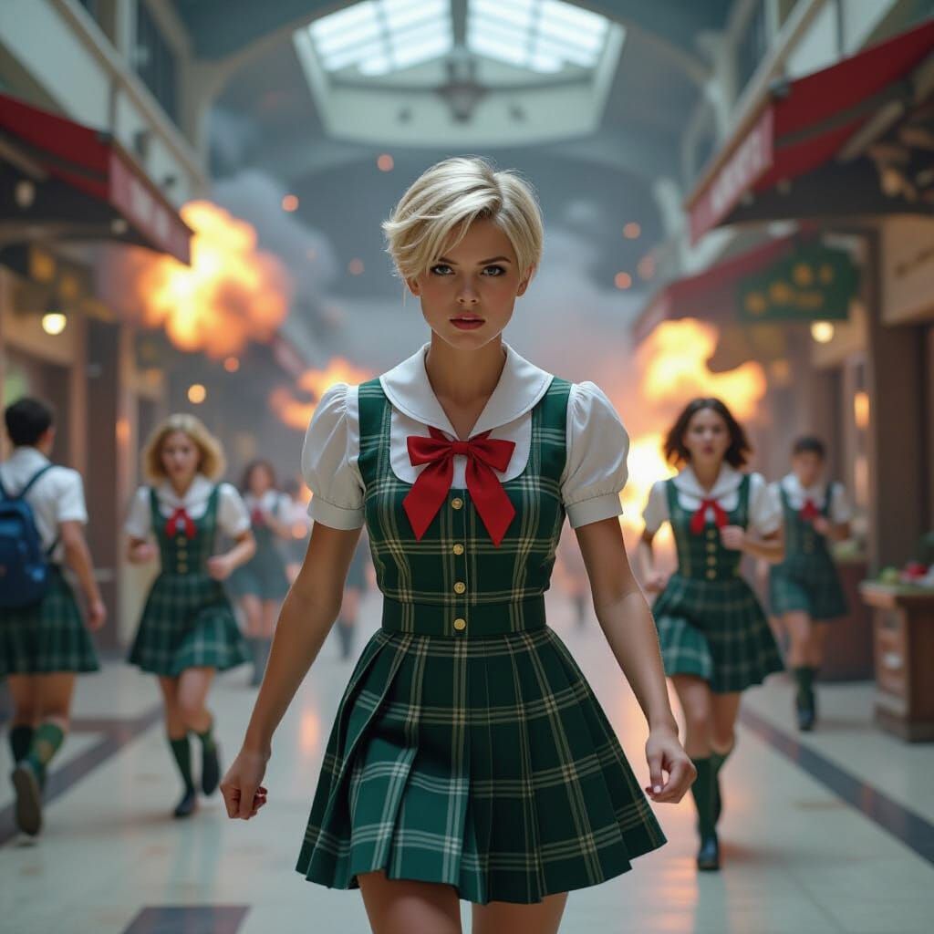 This image shows a chaotic rebellion scene set in an alien marketplace, reminiscent of a video game cover. A young man leads fleeing students against a stern alien headmistress amidst explosions, rendered as a gritty cinematic still.