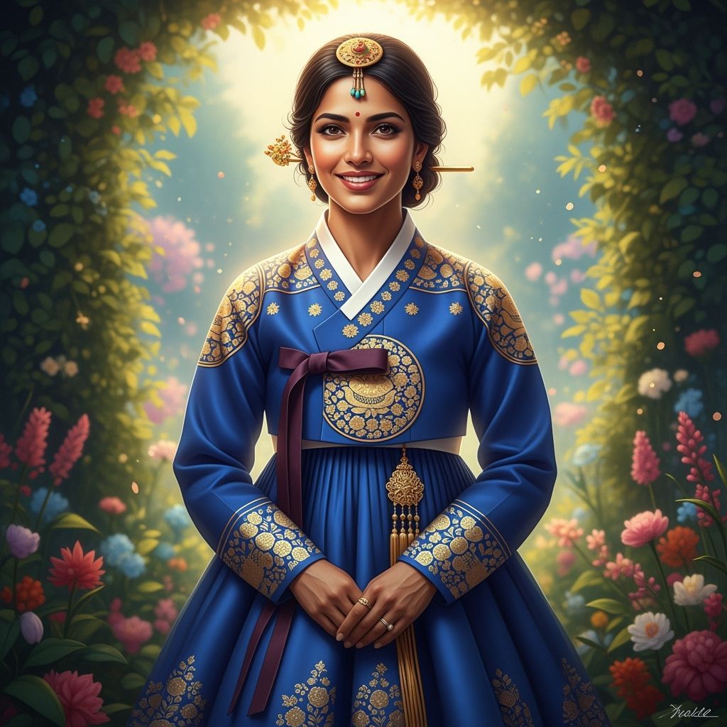 This image shows an Indian woman smiling in a lush garden, wearing a sapphire blue Hanbok with golden embroidery. The digital painting features soft, ethereal lighting and a dreamy atmosphere.