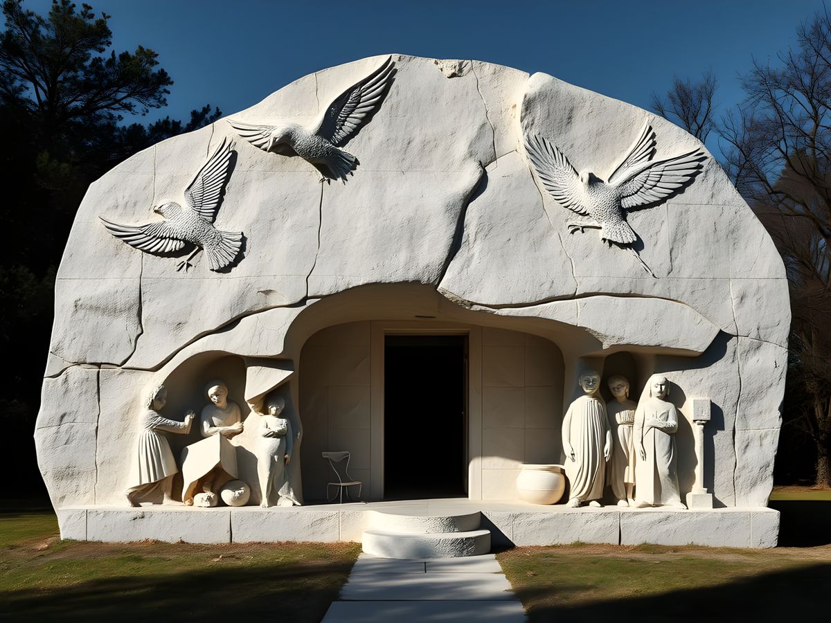 A surreal, abstract birdhouse sculpture with swirling, gravity-defying forms and hidden faces. The dramatic lighting and long shadows enhance the stone figures in this surrealist sculpture.