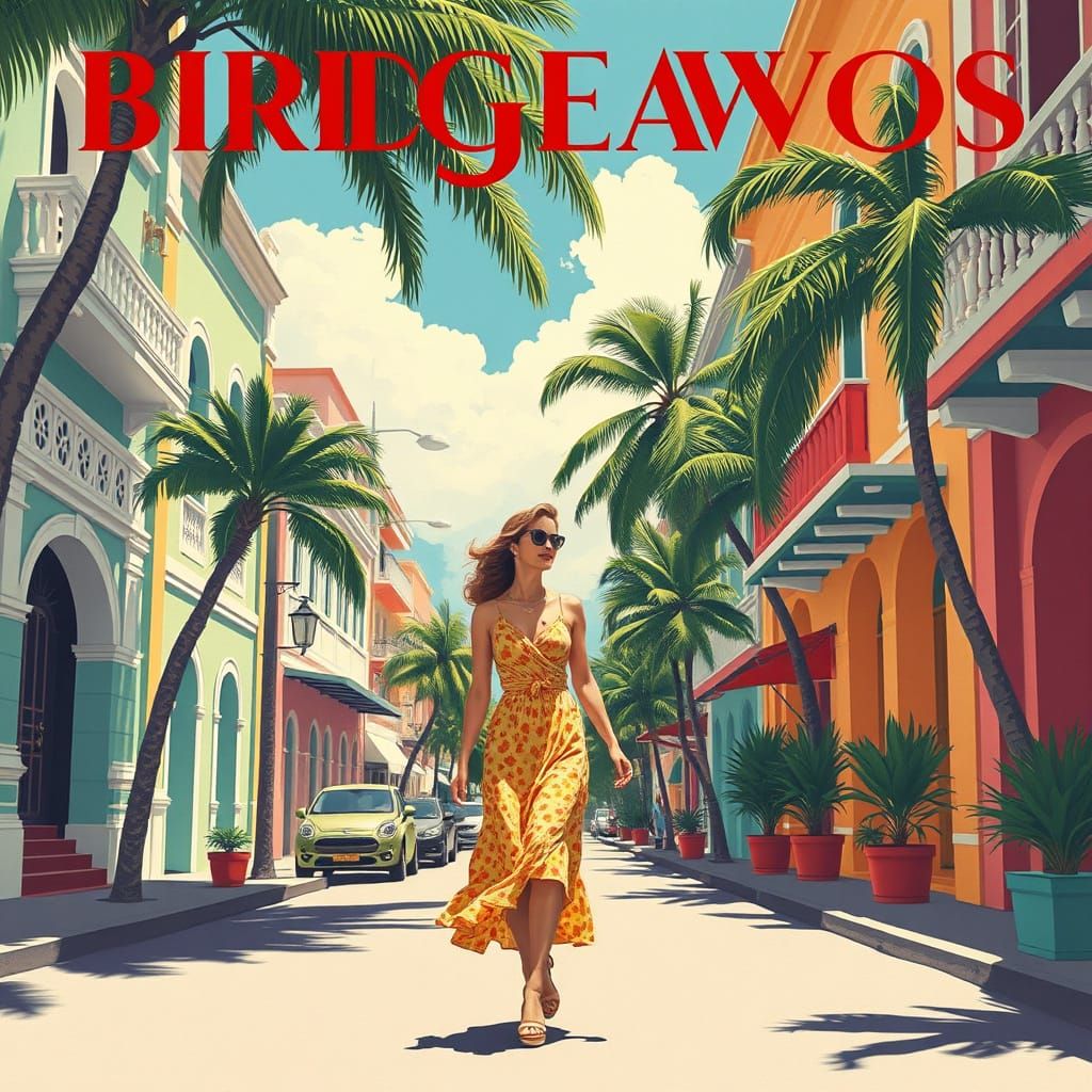 A vibrant vintage travel poster of Bridgetown, Barbados. A woman in a sundress strolls along a colorful street lined with historic buildings and tropical trees, in an Art Deco style.