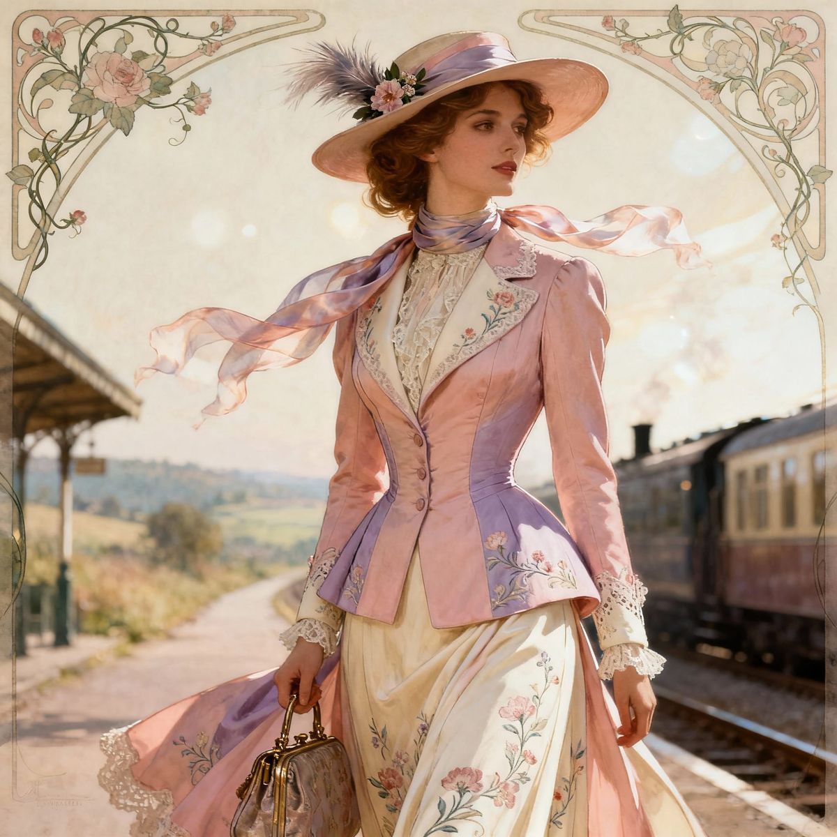 This image depicts a woman from the Art Nouveau Belle Epoque era dressed in elegant travelling attire, showcasing the period's characteristic style and fashion.