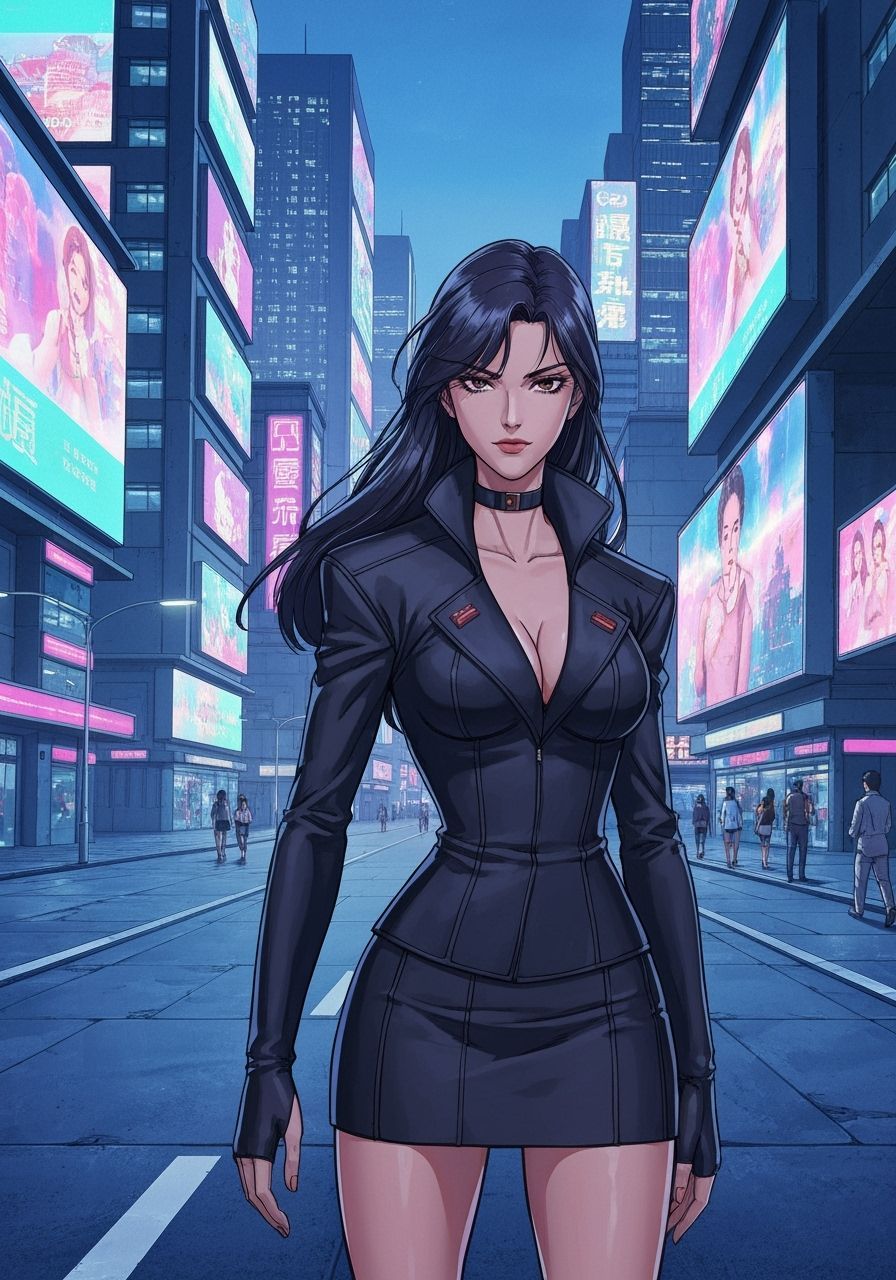 This image shows a bald Asian woman with an eyepatch in futuristic Shenzhen. She is wearing a black turtleneck and miniskirt, in a vibrant, detailed digital matte painting inspired by 90s anime.