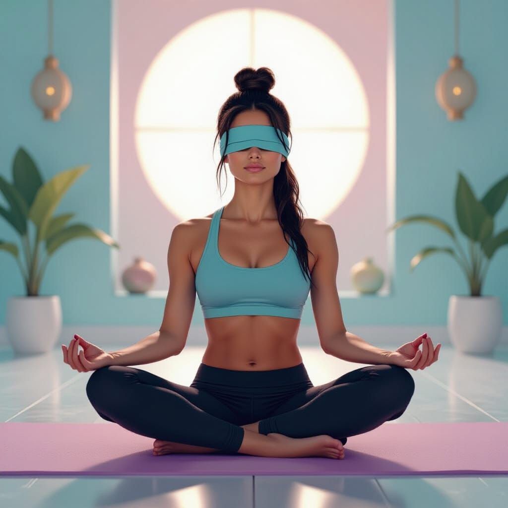 A striking picture of a young, blindfolded woman meditating in a futuristic yoga studio. The image features South Asian decor in a pastel-colored, low-contrast, matte atmosphere, with professional photography style.