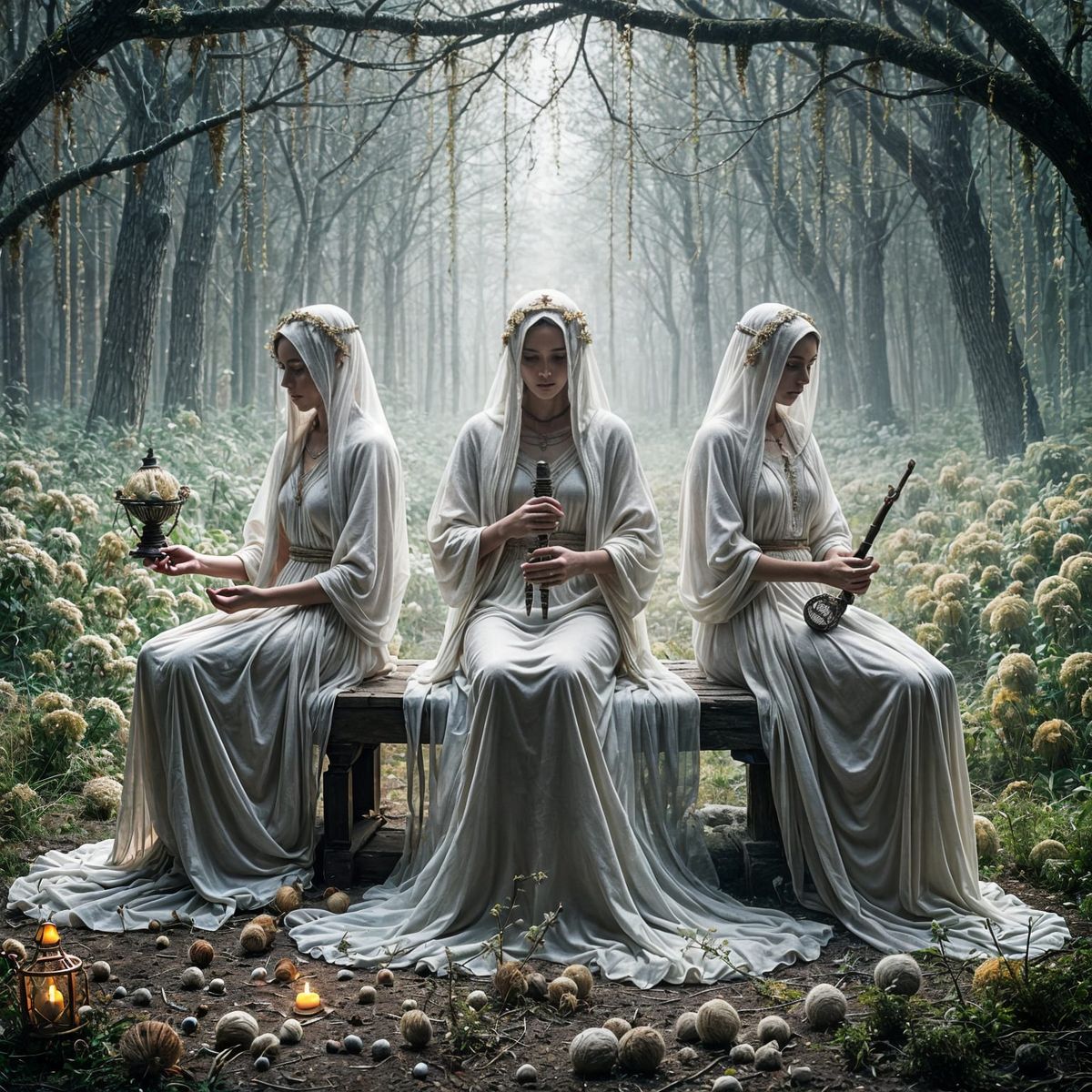 A grayscale image of the Three Fates weaving destiny in a spectral forest. The veiled figures are adorned with floral crowns, surrounded by wool threads, and illuminated by fireflies in an oil painting style.