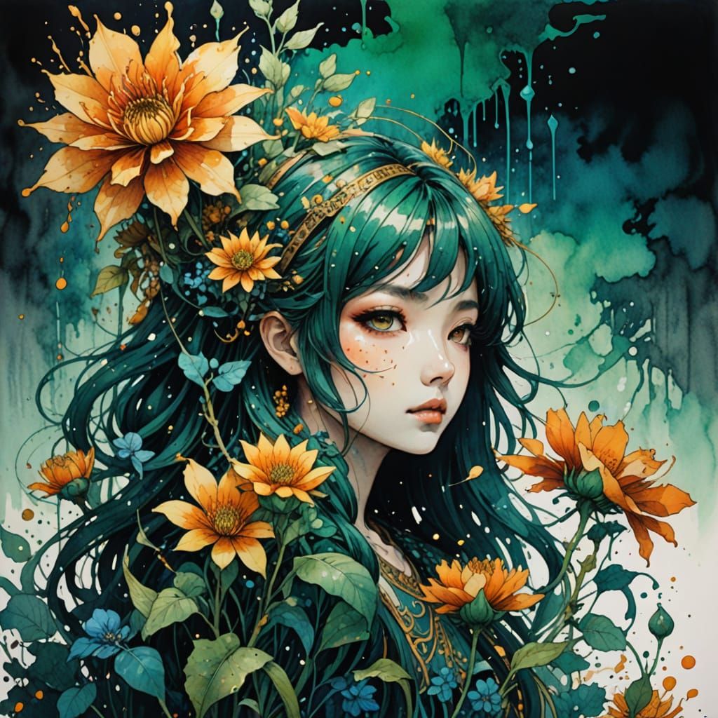 64 megapixels perfect composition, high contrast, cinematic, atmospheric maximalist epic dark green blue brown orange yellow gold cool colorgrading watercolor, wet brush, warm light, wet wash wet on dry, dark color, deep depth, color shading depth, ink details, pen ink and watercolor, low angle, flowers, ...