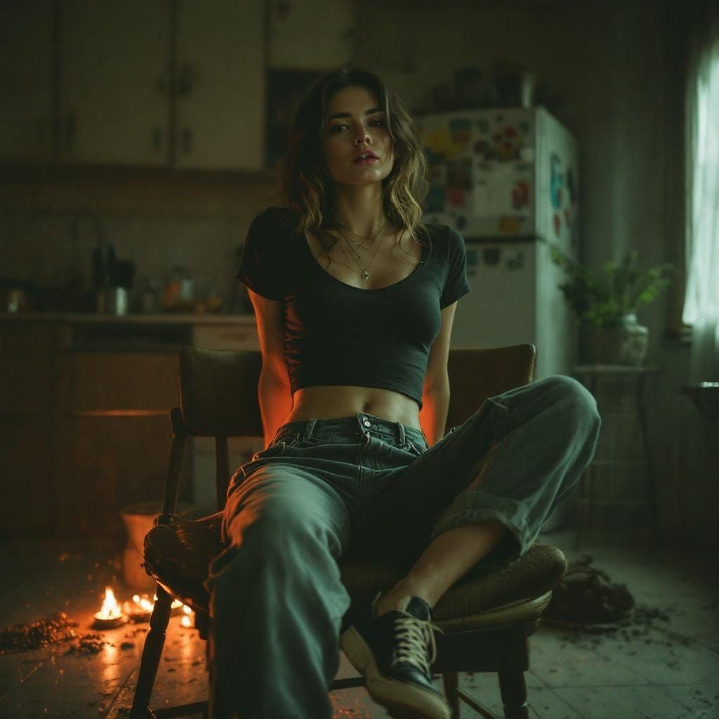 A cinematic photograph of a woman's feet resting on a chair in a kitchen. The realistic image features soft lighting, film grain, and warm and cool color correction.