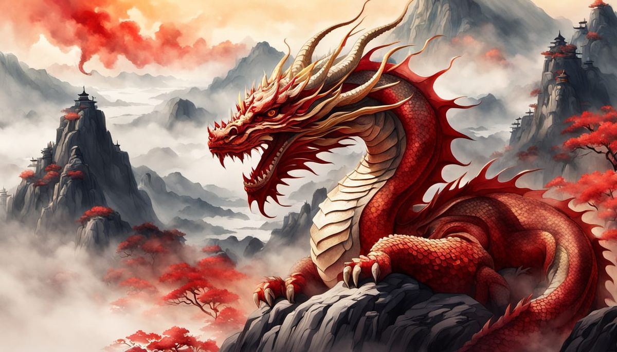 A close-up image of a dragon perched on a mountain, rendered in an ink wash style. The dragon features vibrant red scales, set against a backdrop of cream-colored mist with golden lighting.
