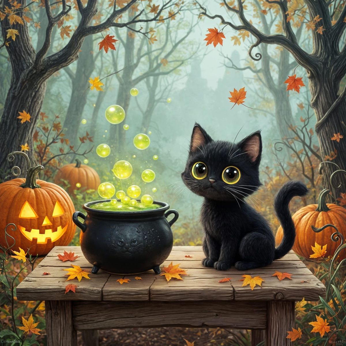 This image depicts a cute black cat on a wooden table in an autumn forest. A bubbling cauldron and Halloween elements create a magical, whimsical atmosphere, like a children's book illustration.