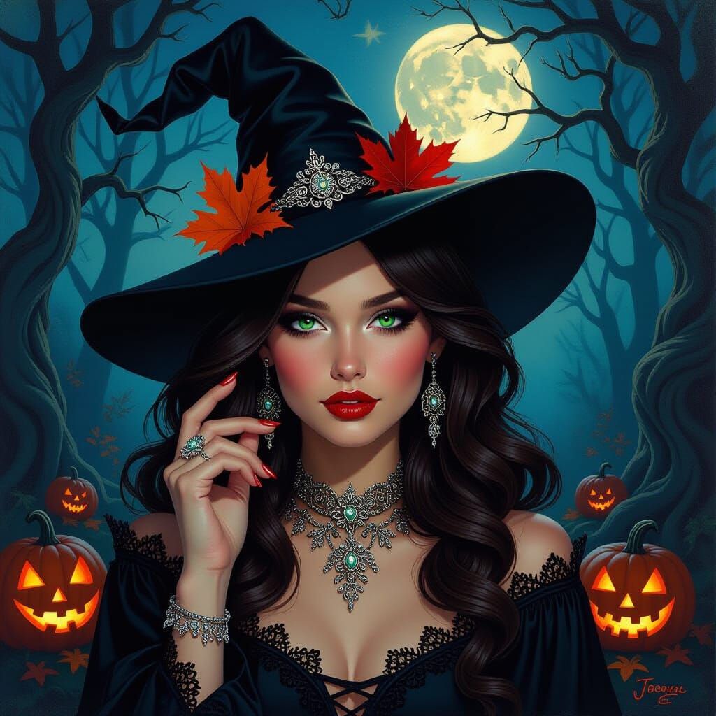 A vibrant impasto oil painting depicts a captivating young witch with cascading dark brown hair framing her face, adorned with intricate silver filigree jewelry that catches the ethereal light. Her piercing emerald eyes gaze directly at the viewer through subtle smoky makeup, while her fingers delicately ...