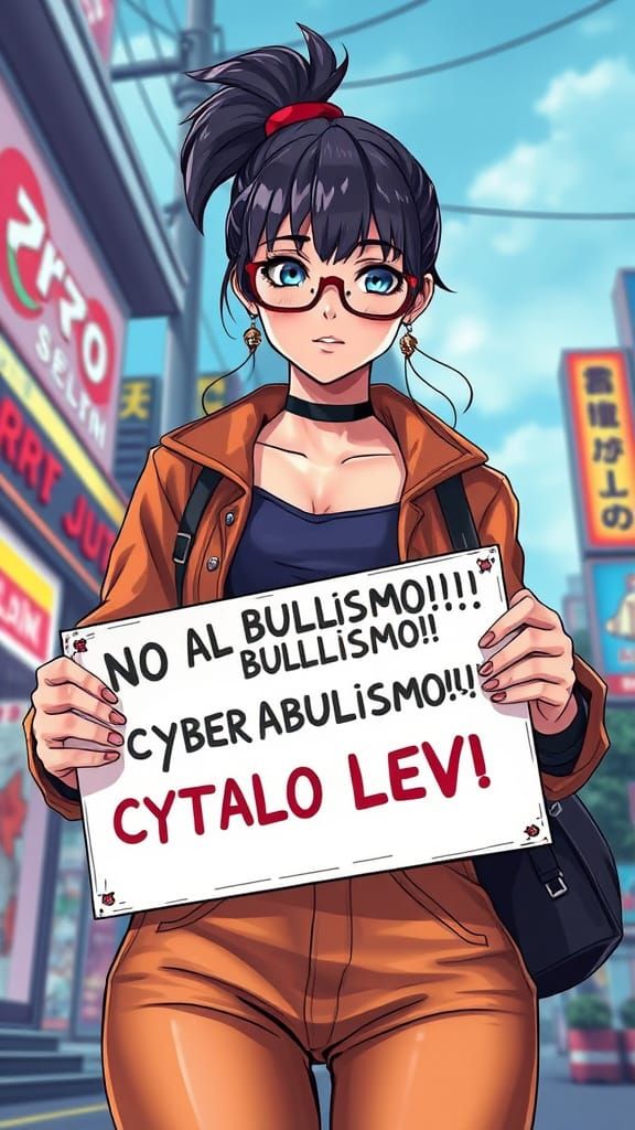 A manga-style image of a woman holding a sign protesting against bullying. This 3D anime art features vibrant colors, intricate details, and textures, in a digital art aesthetic.