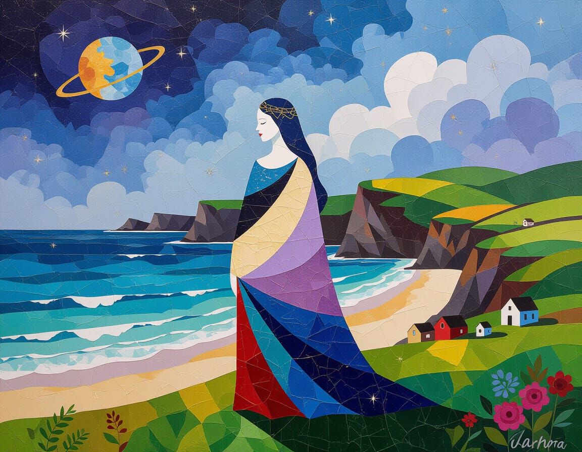 This image depicts a celestial being in a dynamic seascape with dramatic cliffs and cosmic mist. Rendered with grunge oil and watercolor techniques, it features thick, textured brushstrokes and crinkled metallic effects.