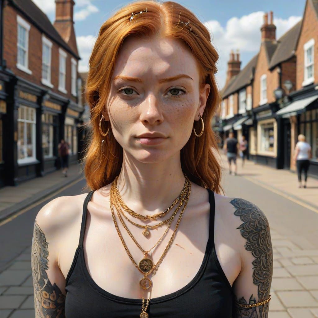 This image shows a stunning hyperrealistic portrait of a young woman with intricate details, set against the charming backdrop of Stratford-upon-Avon.